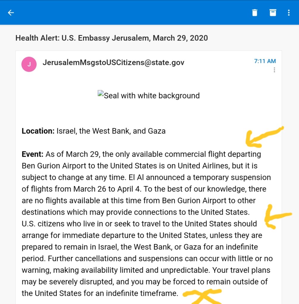 Look above at the email from the Jerusalem Embassy. They inform that there is one airline left to get us back to the United States and it is subject to change at anytime. And if you don’t leave immediately, you will be forced to remain in Israel for an INDEFINITE TIME!